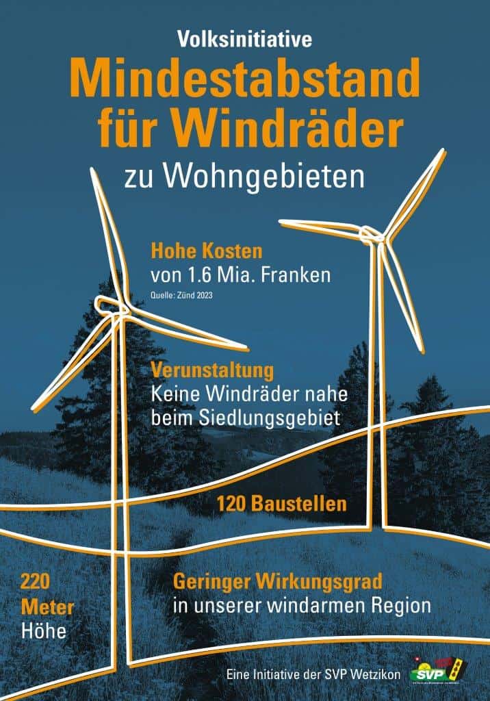 Sollten jemals Windkraftanlagen auf Wetziker Gemeindegebiet erstellt werden, so wie es die Baudirektion des Kantons Zürich derzeit plant, fordert die Initiative einen Mindestabstand solcher Anlagen von 1’000 Metern zu den nächstliegenden Siedlungsgebieten. Wetzikon ist die erste Parlamentsgemeinde im Kanton Zürich, in welcher eine Volksinitiative zu diesem Thema lanciert und erfolgreich eingereicht wird.