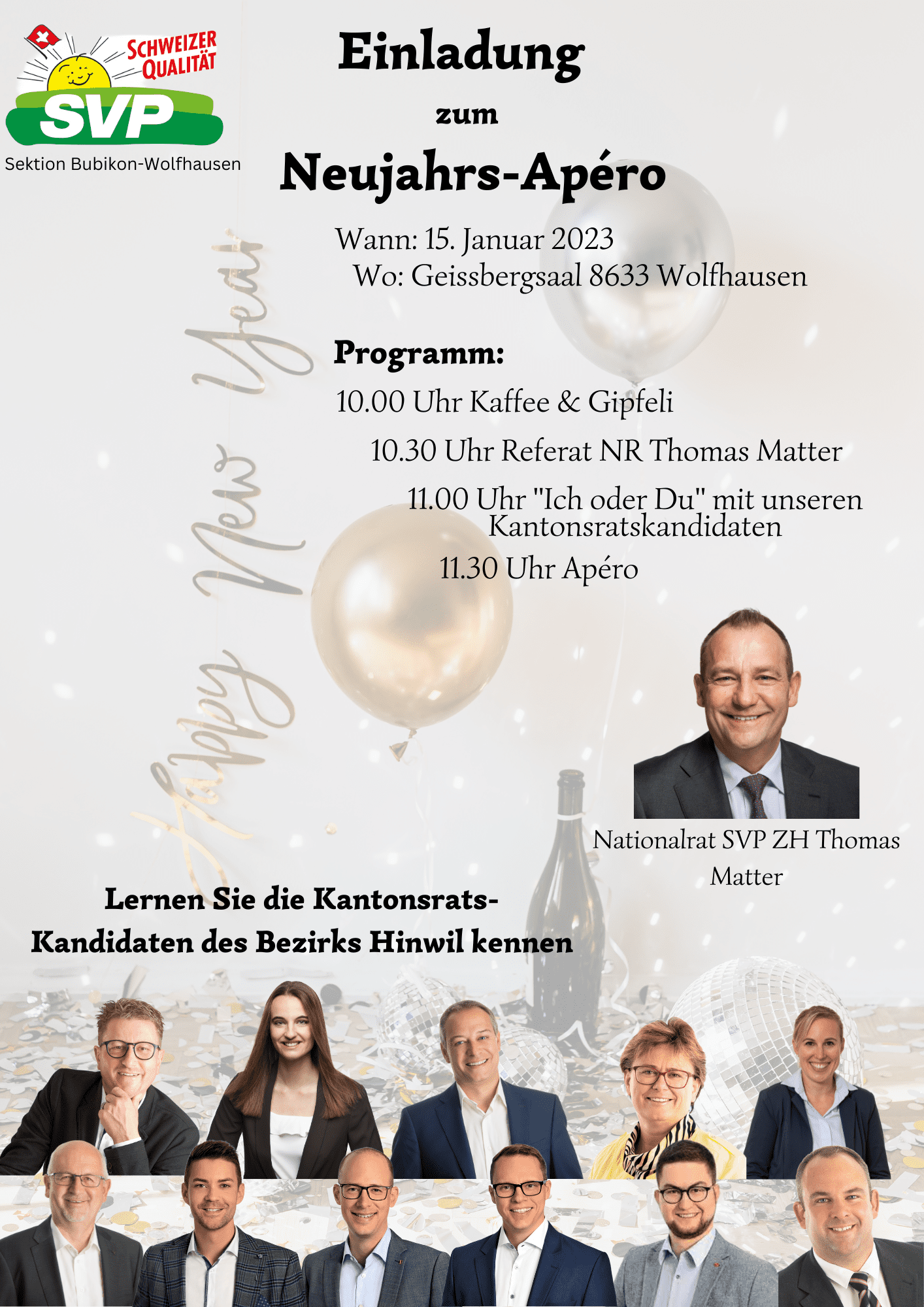 Am Sonntag 15. Januar 2023 findet in Wolfhausen der SVP-Neujahrsapéro mit Gastreferent Thomas Matter (Nationalrat, SVP/ZH) statt. Unsere Kantonsratskandidaten stellen sich in einem „Ich oder Du“-Quiz vor. Alles Weitere können Sie dem nachfolgenden Flyer entnehmen.