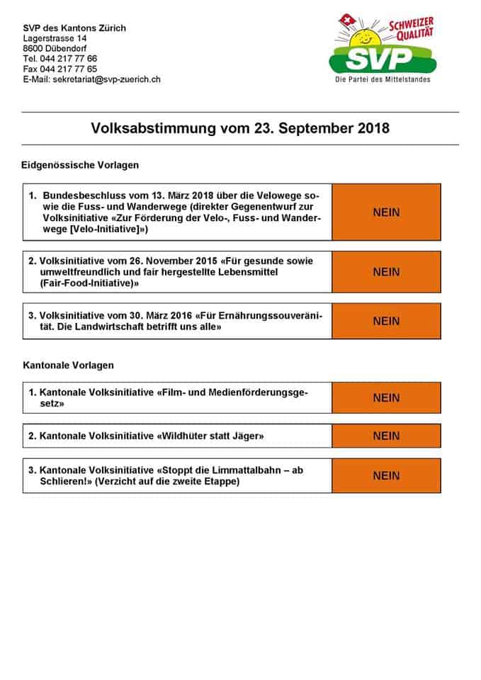 Parolen zur Volksabstimmung am 23. September 2018