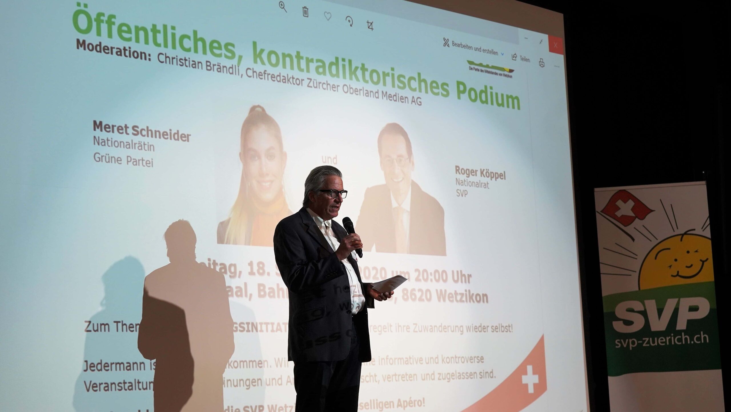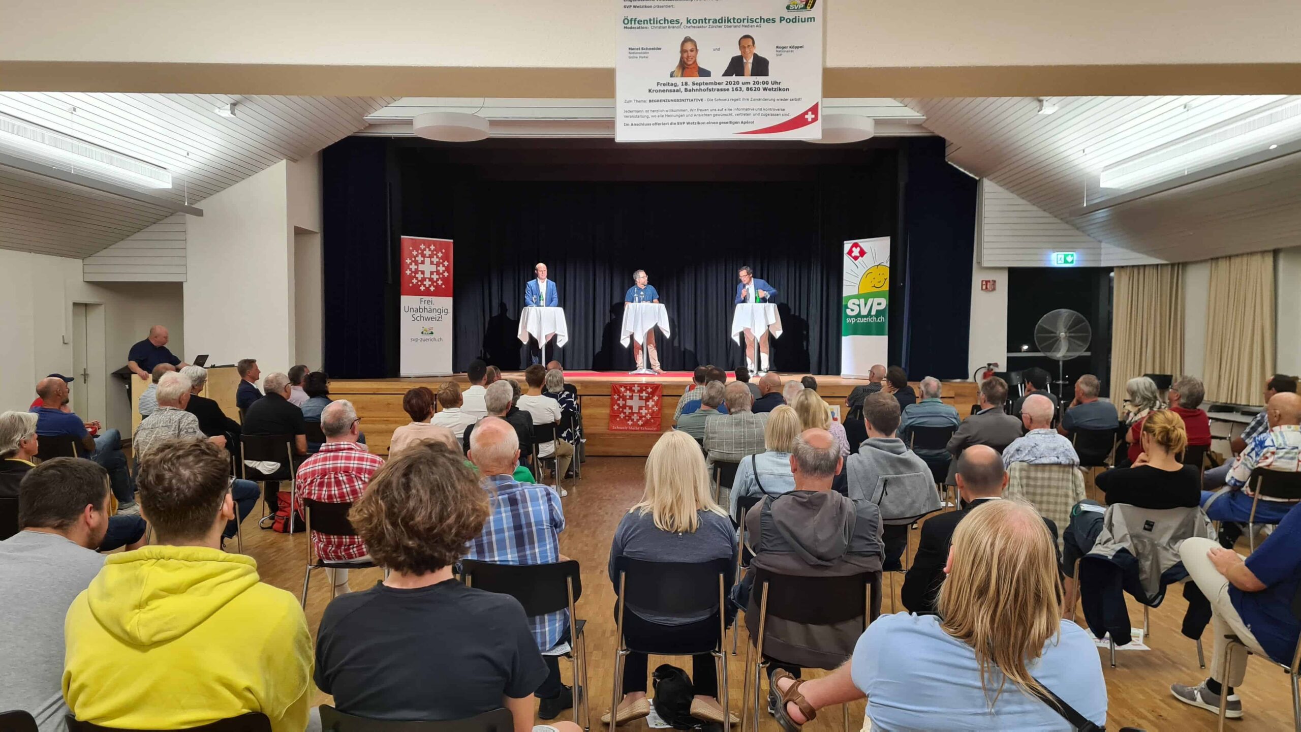 Am Freitag, 18. September 2020 hat die SVP Wetzikon im hiesigen Kronensaal ein kontradiktorisches Podium zum Thema ‚Begrenzungsinitiative‘ organisiert. An der Veranstaltung hätten Nationalrätin Meret Schneider und Nationalrat Roger Köppel teilnehmen sollen. Nachdem Frau Schneider drei Stunden vor Veranstaltungsbeginn überraschend ihre Teilnahme per WhatsApp absagte und keine Ersatzvorschläge machte, ist es der SVP unter grösster Hektik und Anstrengung gelungen, mit Kantonsrat Thomas Forrer, Bezirkspräsident Meilen und Fraktionspräsident Grüne Partei, einen ausgesprochen soliden und eloquenten Politiker zu gewinnen. Thomas Forrer hat sich sehr flexibel und spontan zur Verfügung gestellt und so zu einem doch noch erfolgreichen Abend massgeblich beigetragen.